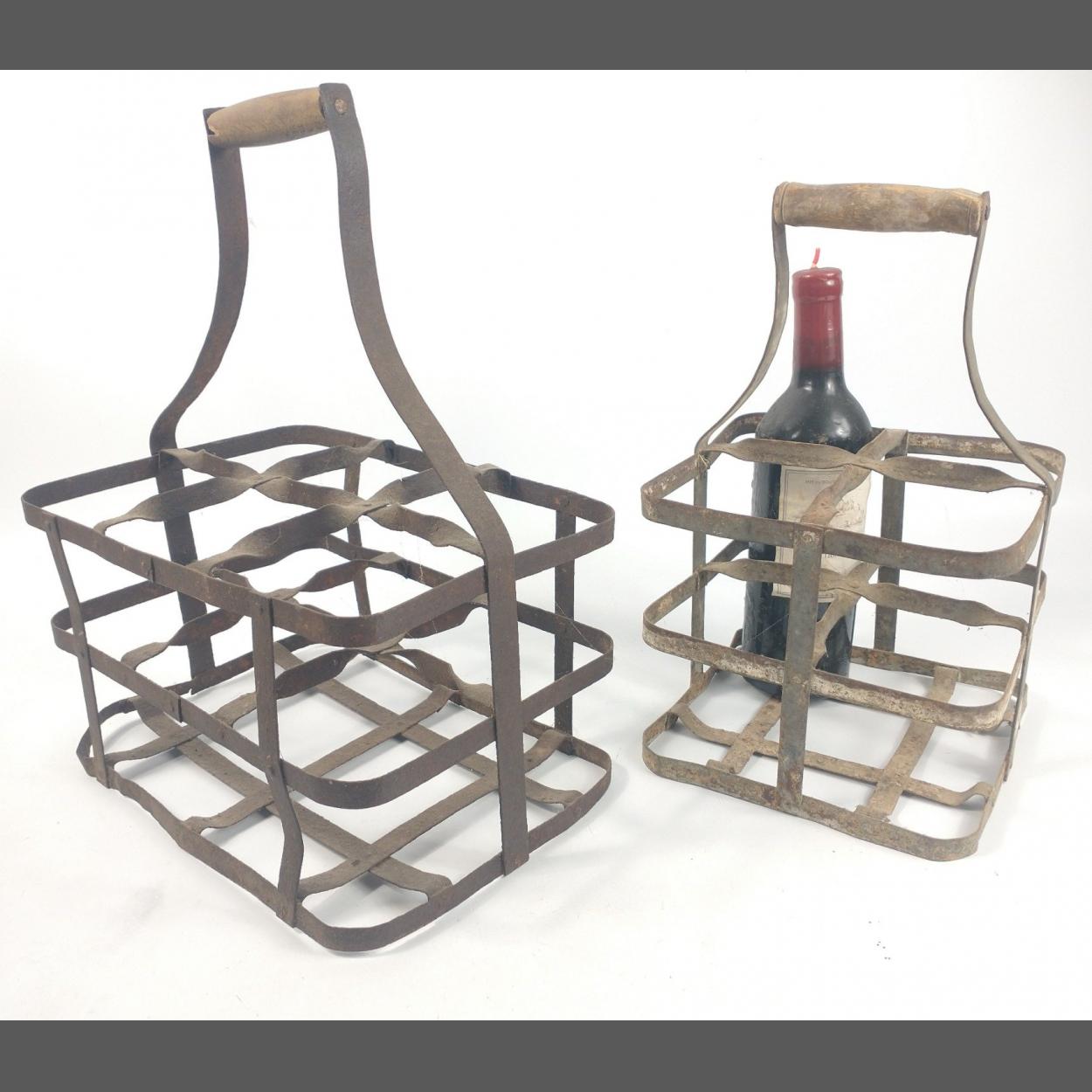 Two metal antique French wine bottle carriers with wooden handles and great original patina - one for 6 bottles and one for 4.