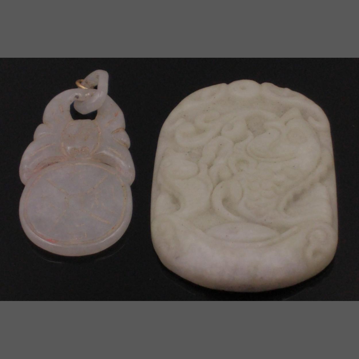Two carved jade pendants one 4cm long, the other, carved with fish is 5cm long