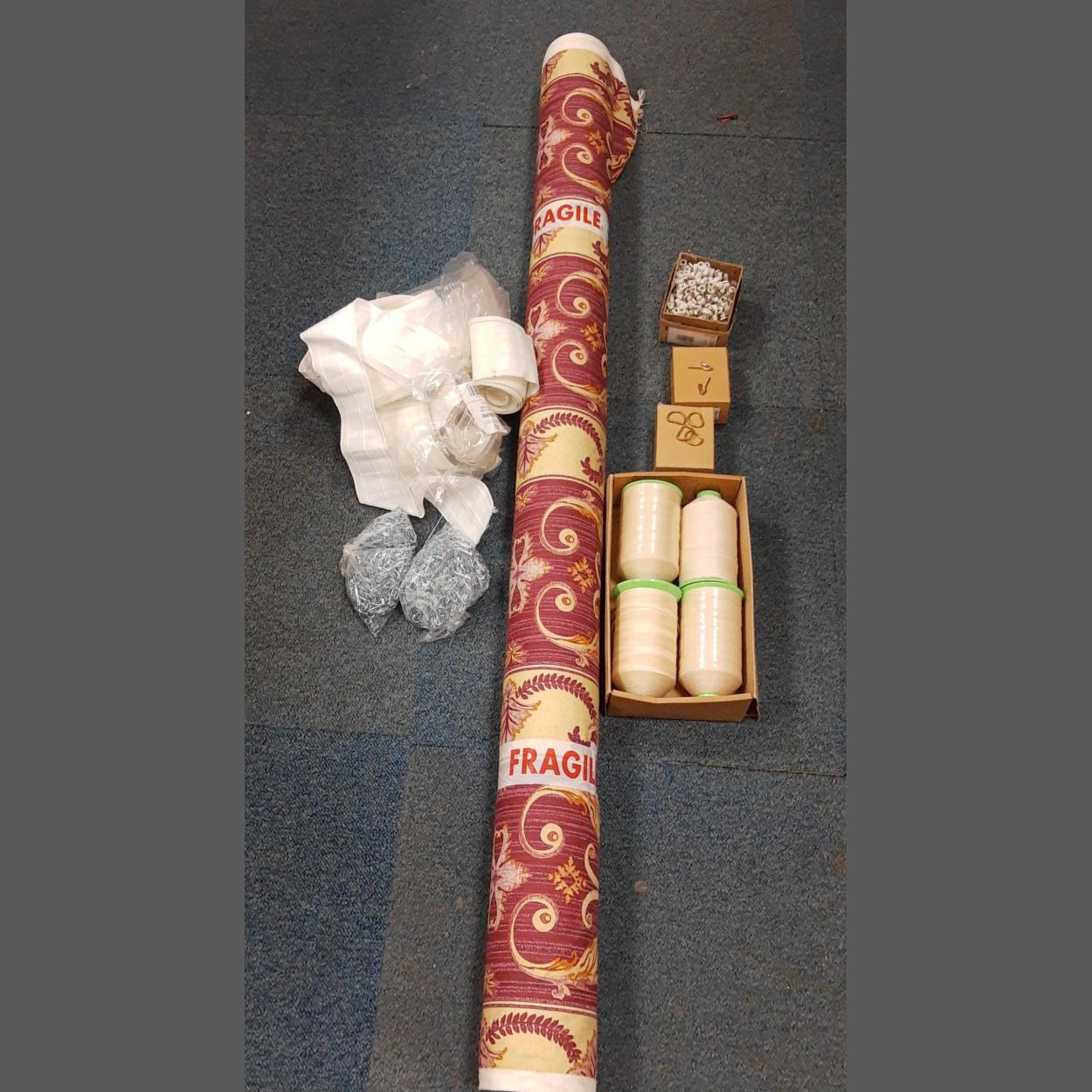 A roll of upholstery fabric in burgundy and gold plus a bagful of curtain rufflette tape, thread and various hooks