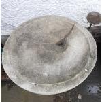 A very old two piece bird bath consisting of a small boy holding up the bath which has been repaired, 60 cm high, best situated leaning against a wall