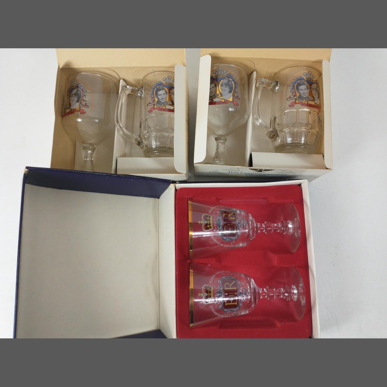 Two boxed 8oz goblets with gold rim by RAVENHEAD in commemoration of the Queen's silver jubilee plus 2 boxed RAVENHEAD sets of 1 tankard in celebration of the marriage of Charles and Diana