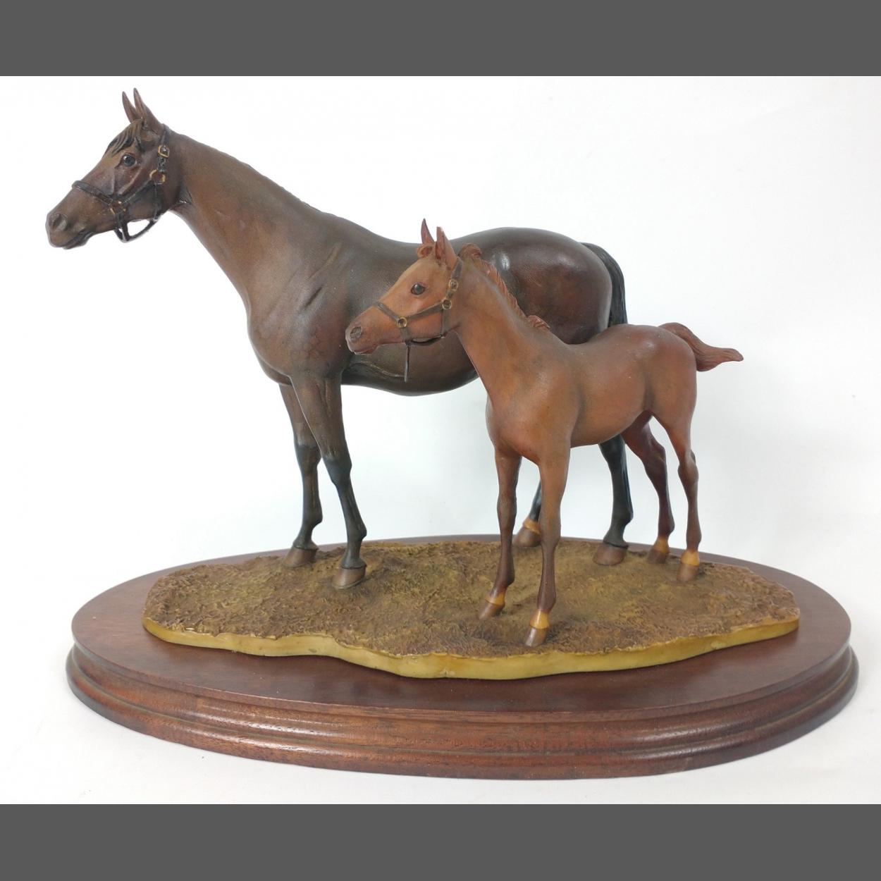 A BORDER FINE ARTS large mare with foal on a wooden plinth, stands approx 20cm high, tiny chip from foal's ear
