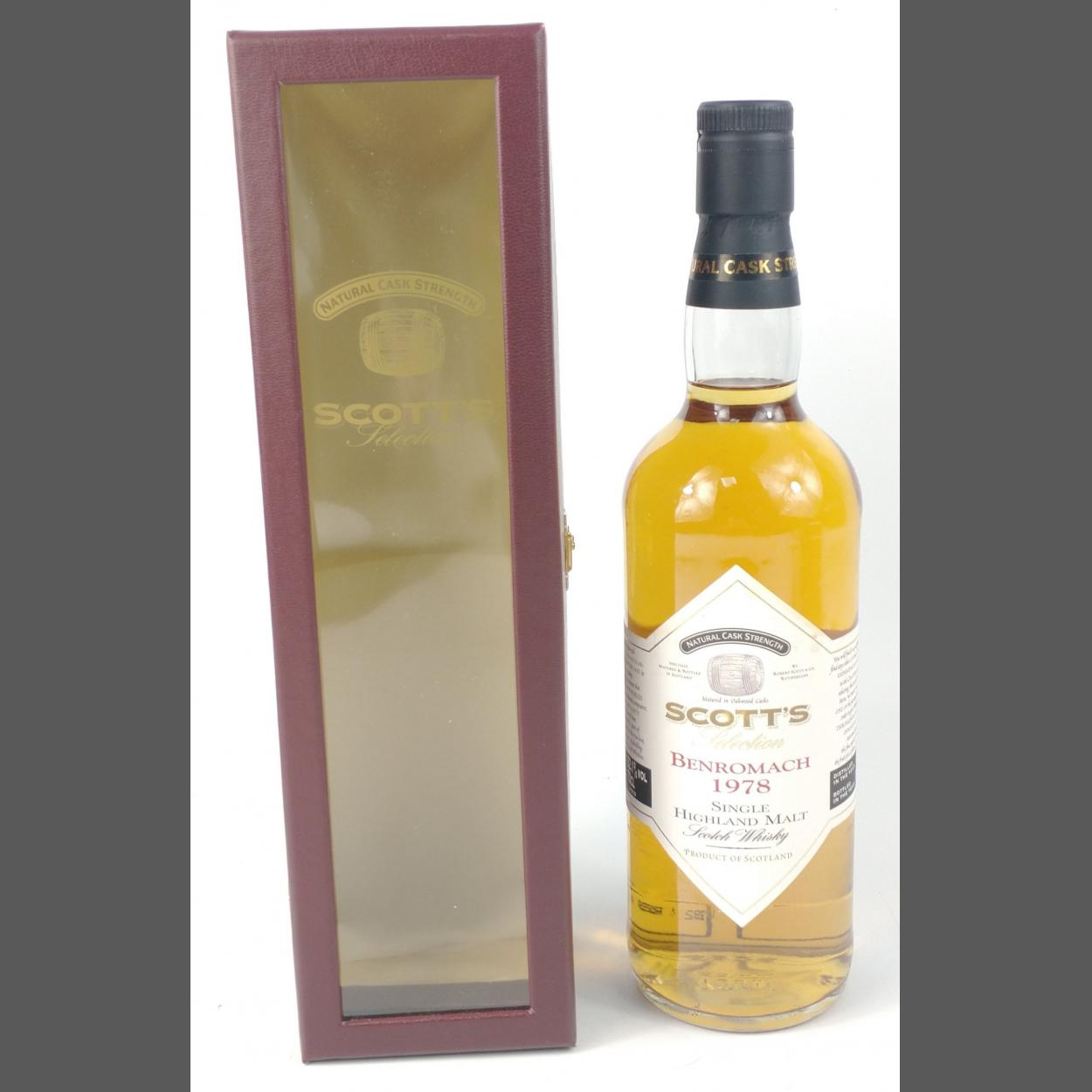 SCOTT'S Selection BENROMACH 1978 Single Highland Malt Whisky 70cl 52.1% natural cask strength and bottled in the year 1996 - still within its original presentation case - seal intact and in bottle excellent condition (as new). The item is sold as described and we do not accept liability for the state of the closure or the taste of the contents.