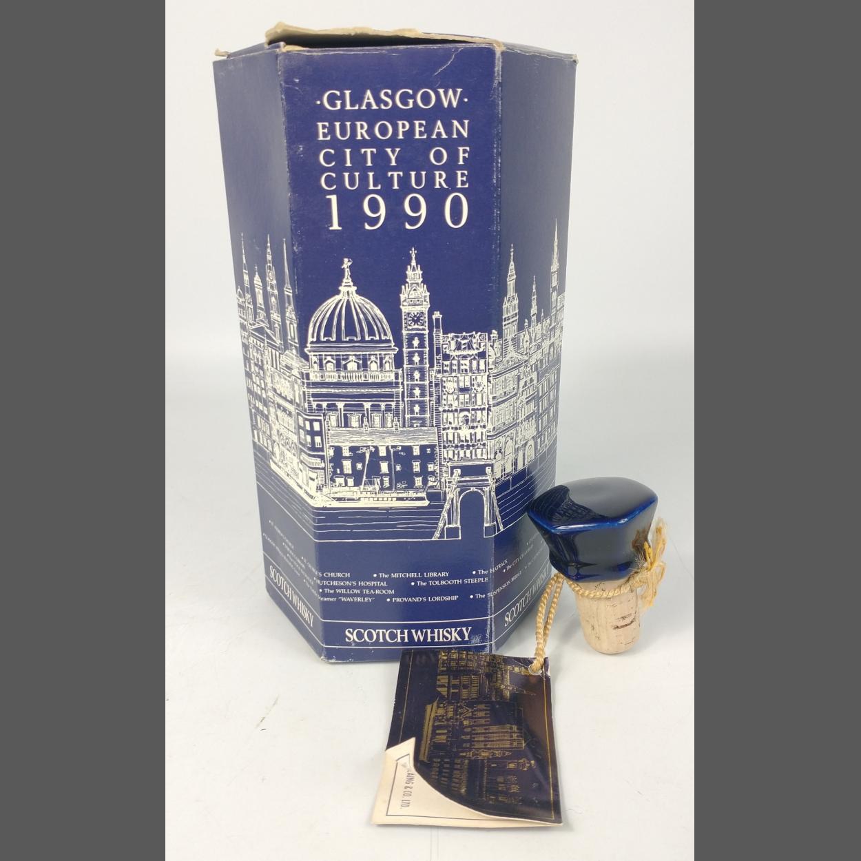 A commemorative 75cl bottle of GLASGOW EUROPEAN CITY OF CULTURE 1990 Premium Blended Scotch Whisky 40% volume with original box. The item is sold as described and we do not accept liability for the state of the closure or the taste of the contents.