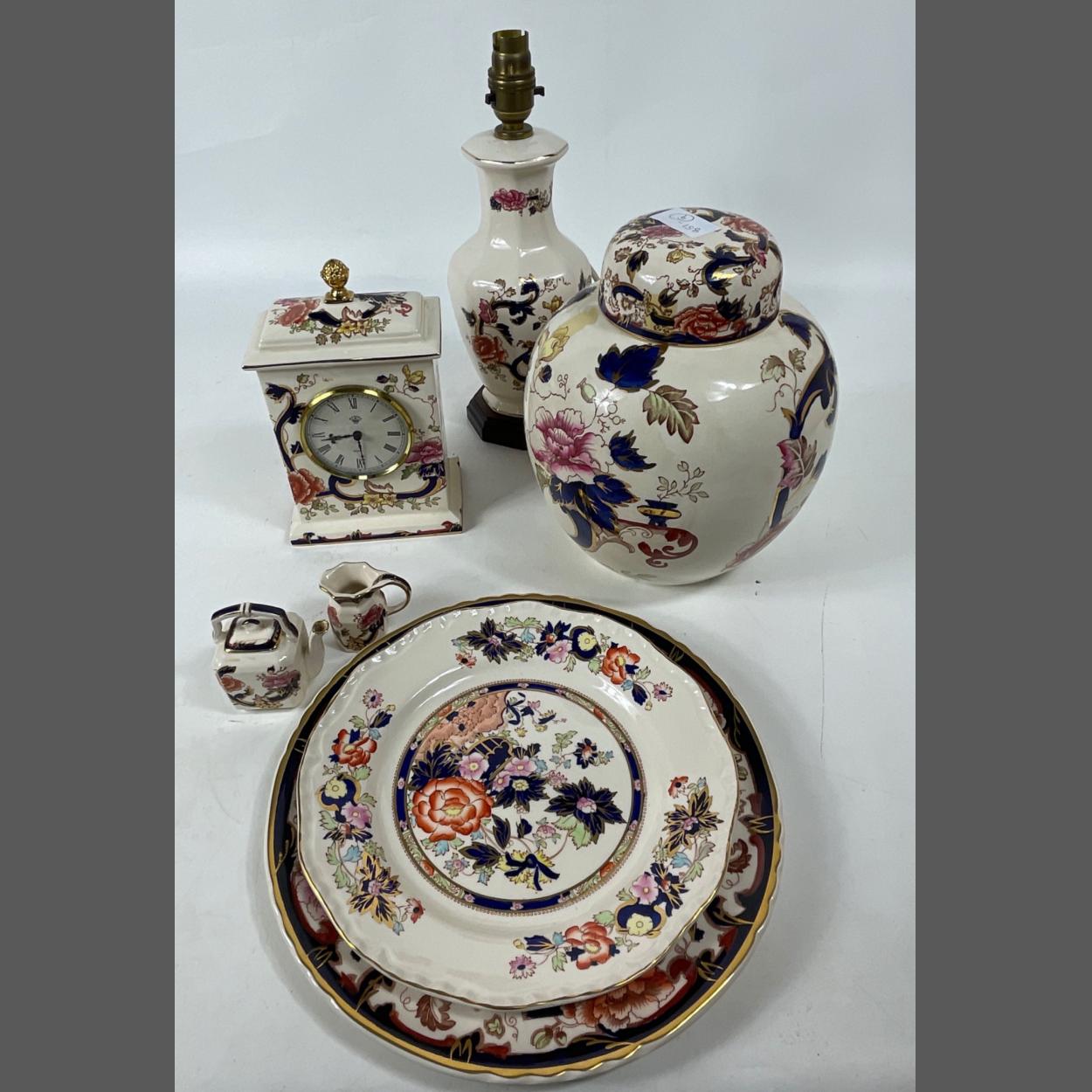 A collection of MASON'S Ironstone pottery in the MANDALAY pattern to include a mantel clock (approx 23cm high, chip missing from rear of clock, not visible from front), a ginger pot (25cm approx), a table lamp on a wooden plinth (30cm high approx), a plate (26cm dia) and a Mandarin plate (22cm), a miniature kettle and jug