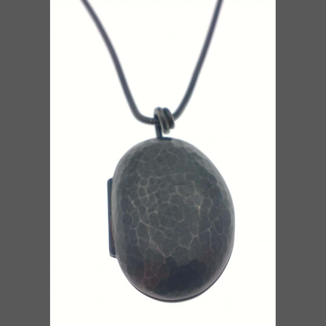 An intriguing blackened sterling silver locket with London hallmark in the shape of a coffee bean or possibly an oyster on a matching slinky snake hallmarked chain. Lovely gilt interior contrasts superbly with the darkened finish. Total gross weight 17g approx. Locket measures 3cm top to bottom. Chain measures 50cm approx total length. Locket carries JW maker's mark.