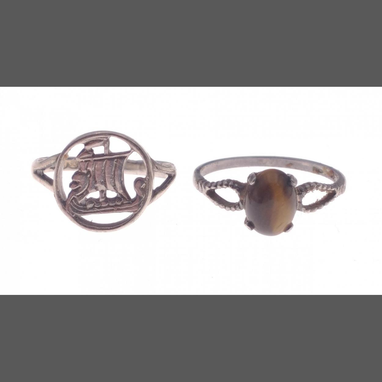 Two silver rings, one with a Viking ship design, the other with a brownish coloured centre stone - combined gross weight 2.65g - ring size both I