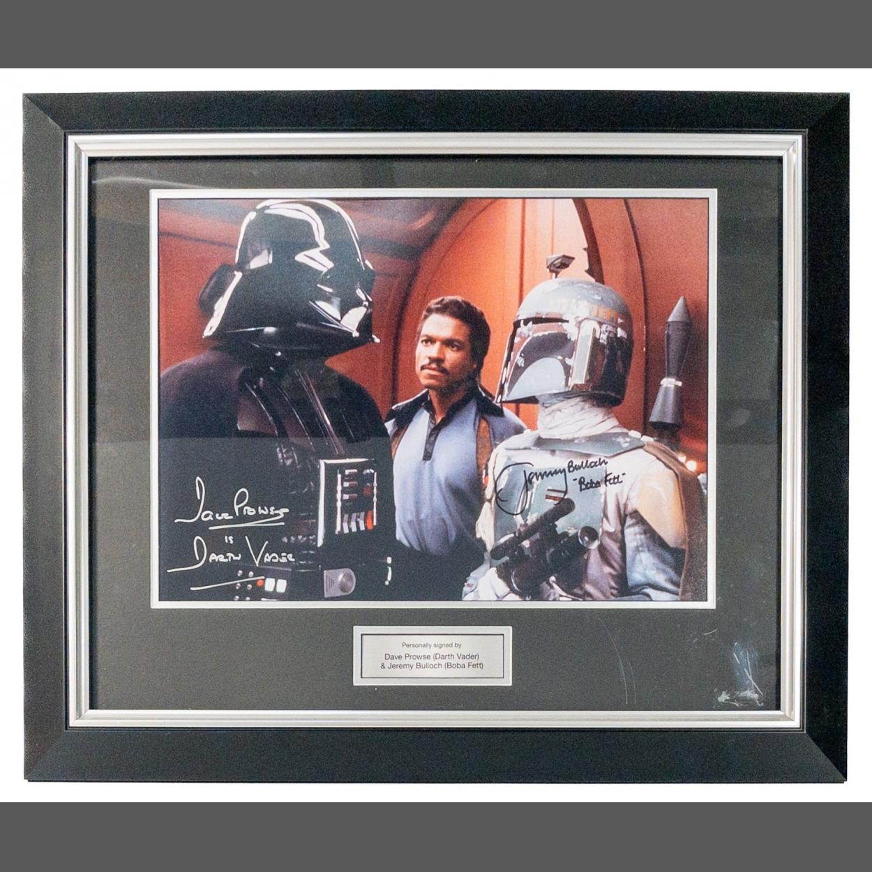 Framed and signed photograph David Prowse(Darth Vader) and Jeremy Bulloch(Boba Fett) both signatures authenticated by Danbury Mint signed 23rd March 2014 with certificate verso 58cm x 48cm approx