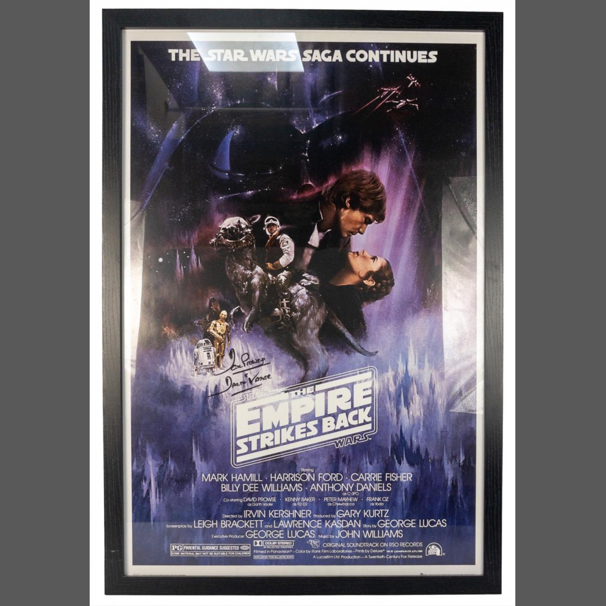 A large framed signed poster by Jack Prowse(DARTH VADER) The Empire Strikes Back with certificate of authenticity verso by Danbury Mint - dimensions 96cm height x 66cm width