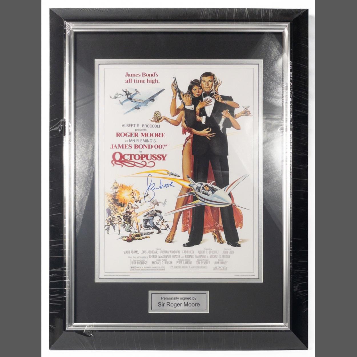 NEW AND UNUSED! QUALITY MOUNTED AND FRAMED JAMES BOND OCTOPUSSY signed Sir Roger Moore Film Poster authenticated by a Danbury Mint certificate pictured with Roger Moore signing the poster signed date October 25th 2016