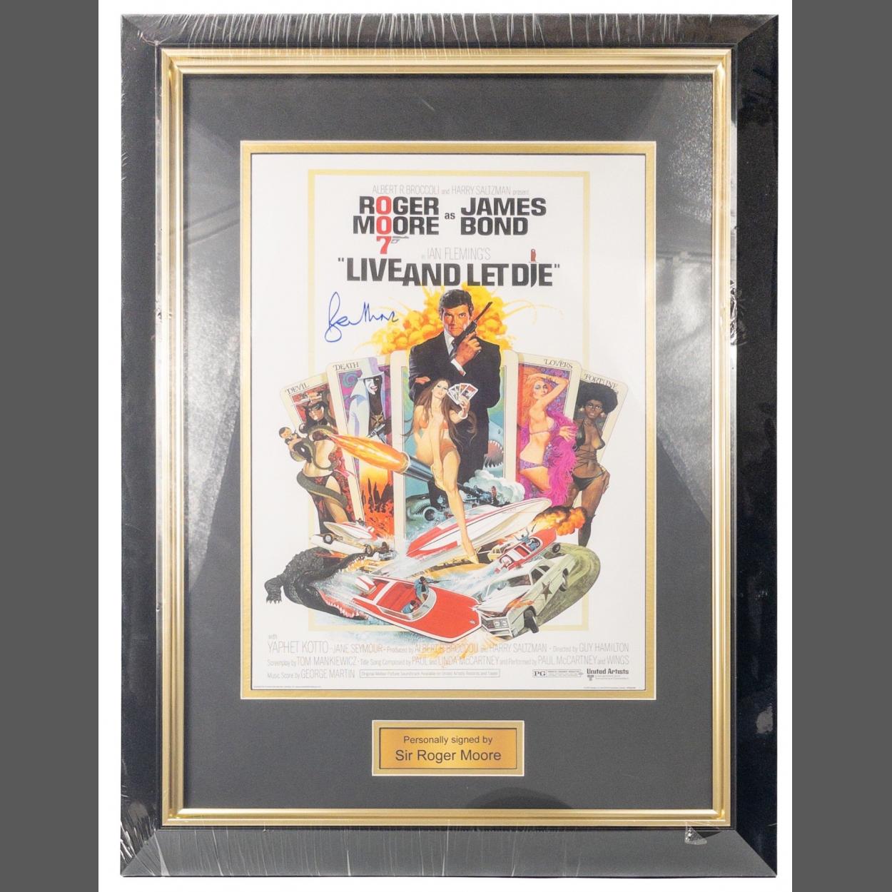 NEW AND UNUSED! QUALITY MOUNTED AND FRAMED JAMES BOND LIVE AND LET DIE signed Sir Roger Moore Film Poster authenticated by a Danbury Mint certificate pictured with Roger Moore signing the poster signed date February 6th 2015