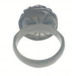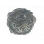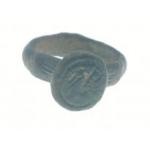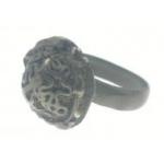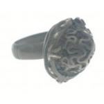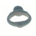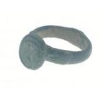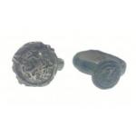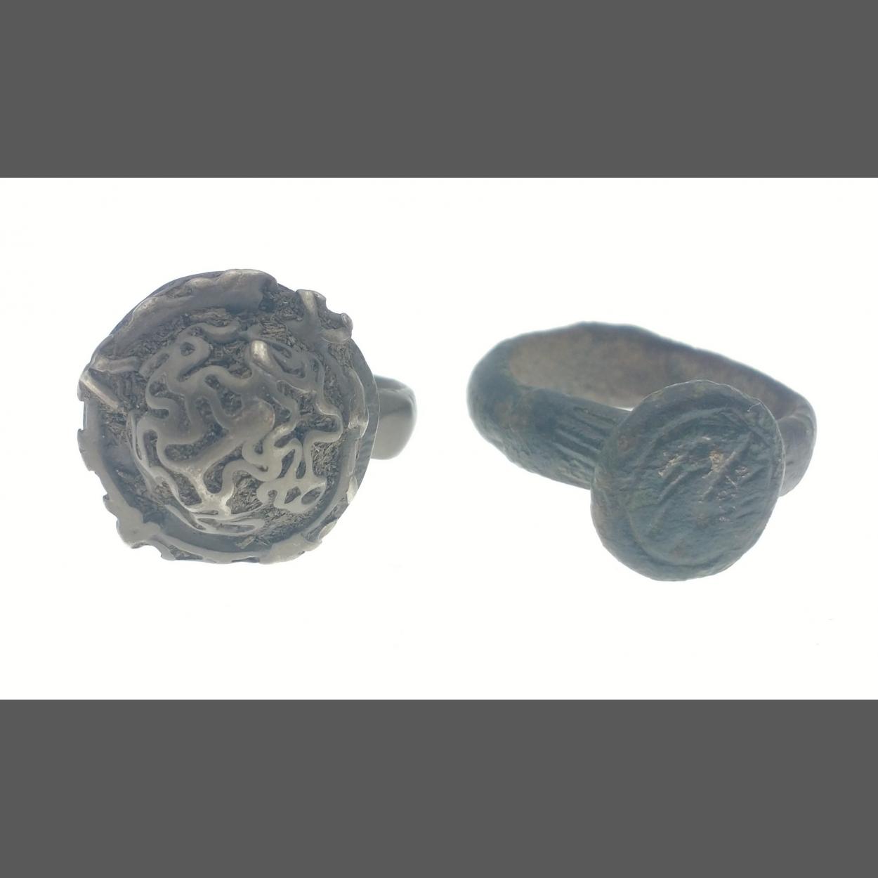 Two ancient rings. One appears to be a Roman coin ring with an unidentified image, the larger one is heavier with a more intricate patterned bulbous head. A very unusual and attractive pair of rings.