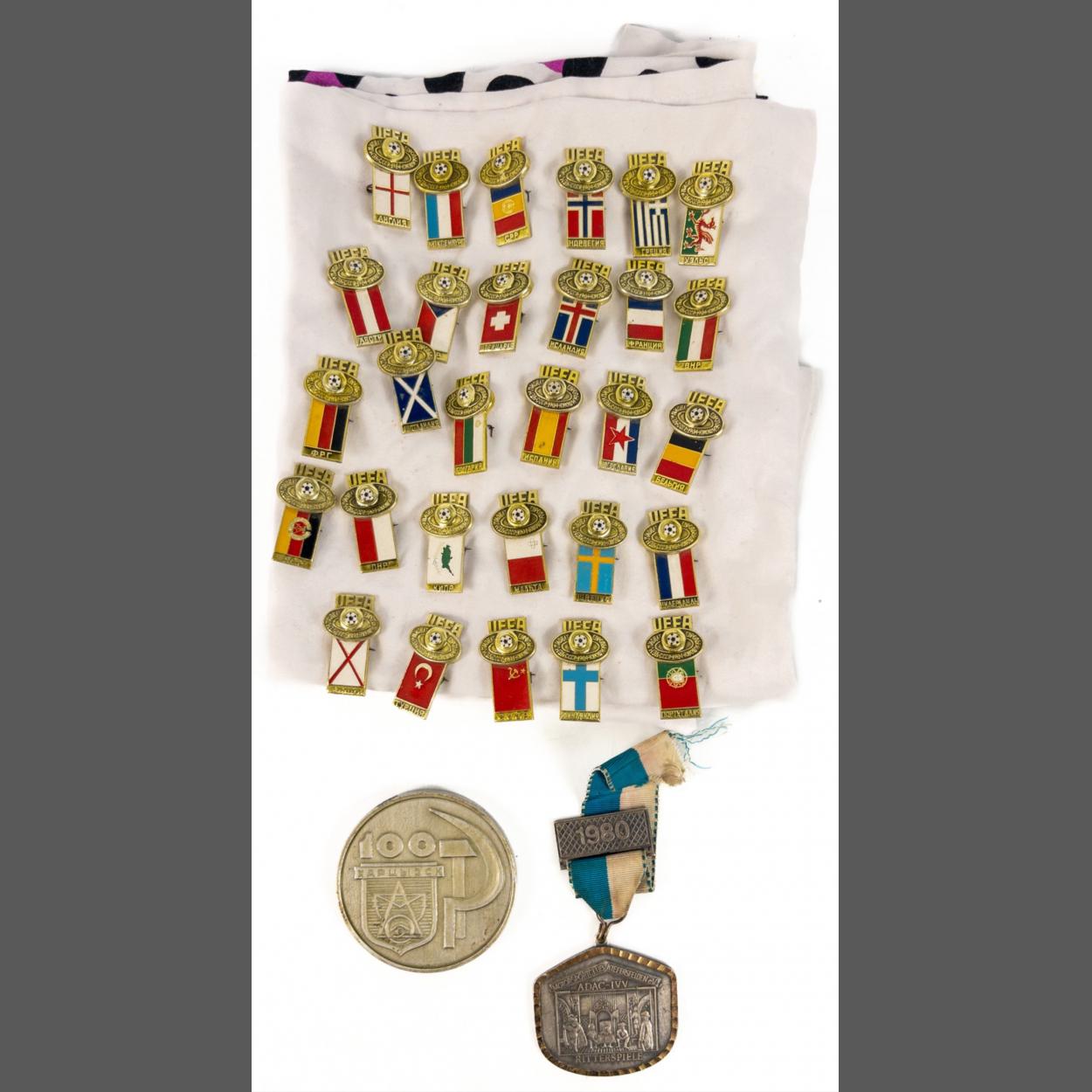 A cloth piece with Russian World Cup National tin type badges showing participating countries national flags. 29 badges in total. Also included a large (67mm) aluminium type medallion 100 year commemorative Soviet type and a 1980 Ritterspiele medal from Kiefersfelden