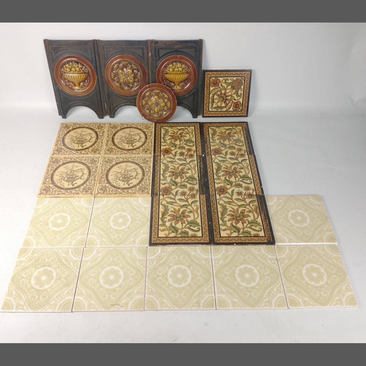 Superb collection of Antique Victorian fireplace tiles by MINTON and WEDGWOOD. To include seven floral inspired MINTON tiles which appear to make up two side sets of three each with a bordered single tile. There are ten narrow border pieces which at 6" match the dimensions of the tiles. Additionally there are three Wedgwood circular ceramic tiles within cast iron surrounds and one loose roundel. Also included are four cream tiles with naturalistic scenes of a fruit basket on a bough, these are stamped 'Mintons China Works, Stoke on Trent' The lot is completed by eight more moden light green Pilkington tiles.