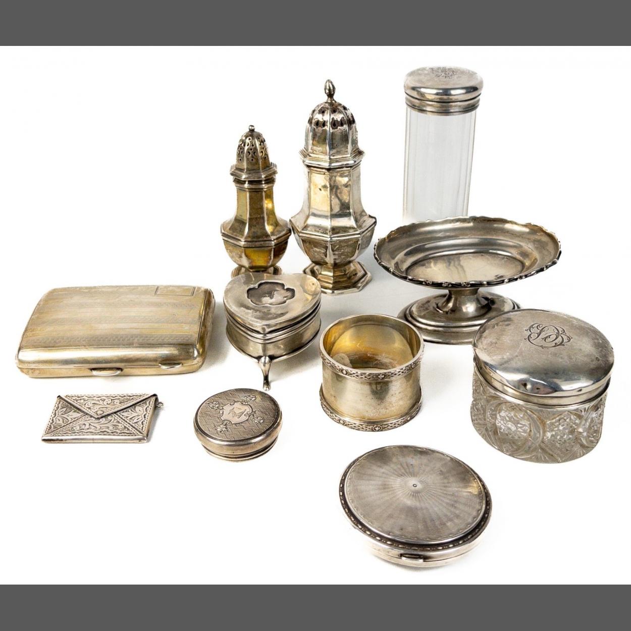 An intriguing collection of hallmarked sterling silver items to include two small sifters, pin tray, napkin ring, cigarette case, two silver topped glass bottles with one loose top, a stamp holder and a pill box. Total gross weight excluding the glass bottles is 315g approx.