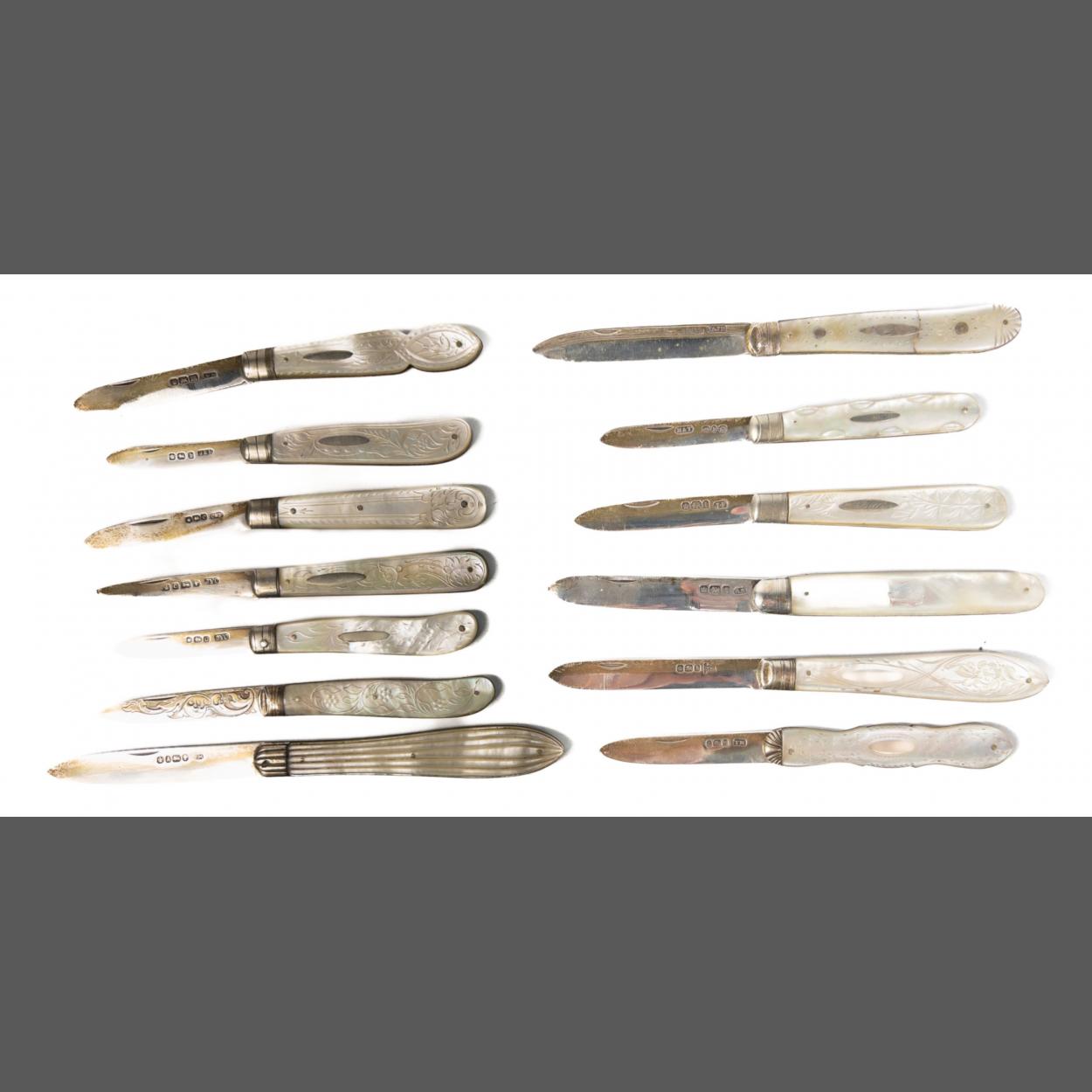 NOW WHERE DID I PUT MY POCKET KNIFE? A super collection of thirteen (Yes, Thirteen!) Mother of Pearl handled silver bladed (all hallmarked) fruit knives. Various makers, dates. etc. A few little bends and blunted tips but a really super collection.