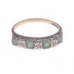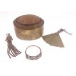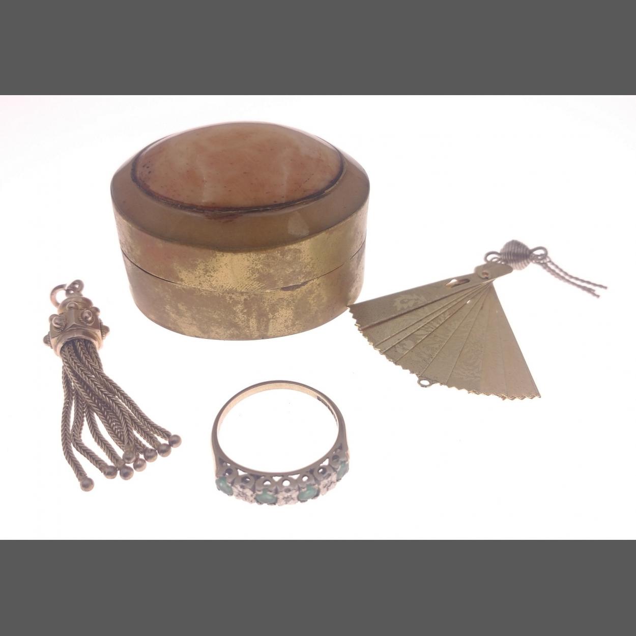 An unmarked 'yellow metal' charm weight 3.98g approx and also a 'yellow metal' small expanding fan charm or pendant gross weight 3.94g approx with a vintage 375 stamped yellow gold ring with three small diamonds (tested) and three small emeralds 2.12g gross approx with also a small brass trinket box with centre oval stone