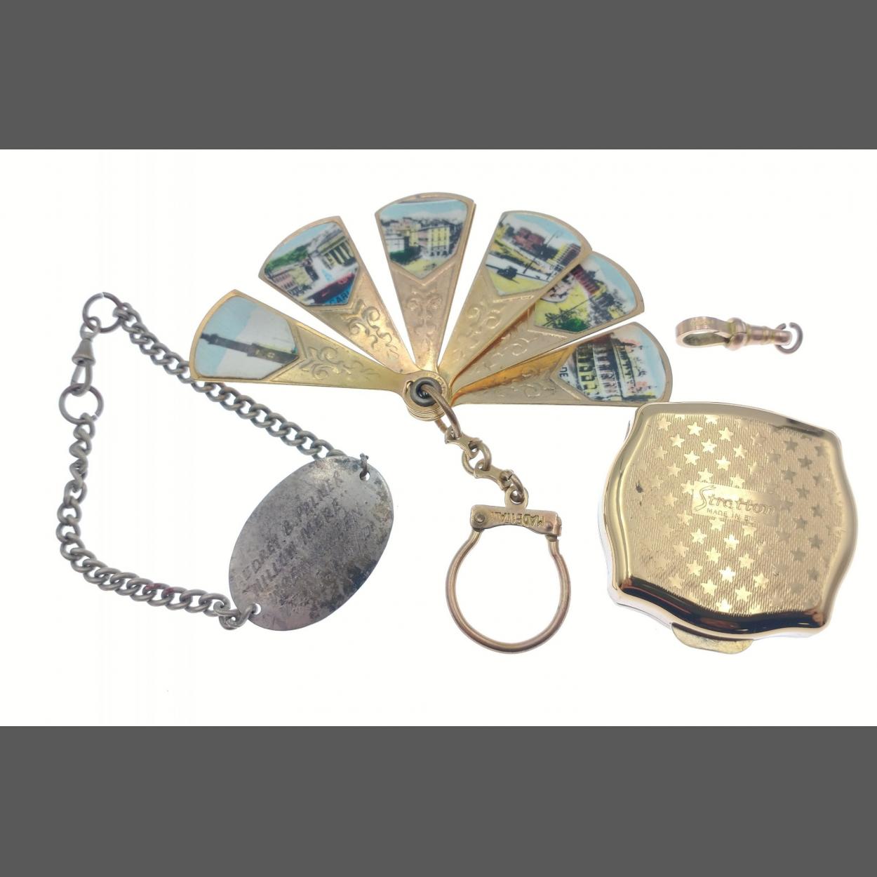 A small box to include a STRATTON yellow metal pill box, a tourist-style fan key-ring, a white metal oval inscribed trinket and a small old watch chain catch stamped 9 ct