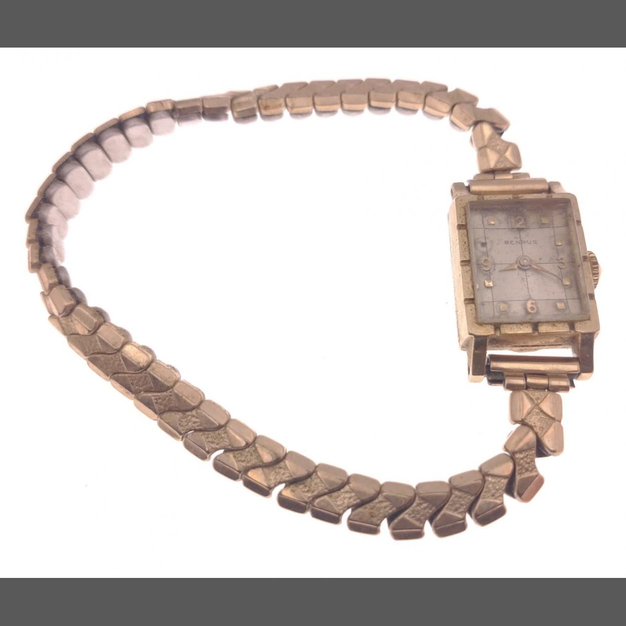A vintage BENRUS branded ladies 14k stamped yellow gold cased wristwatch with expanding yellow metal bracelet - gross weight 16.49g approx