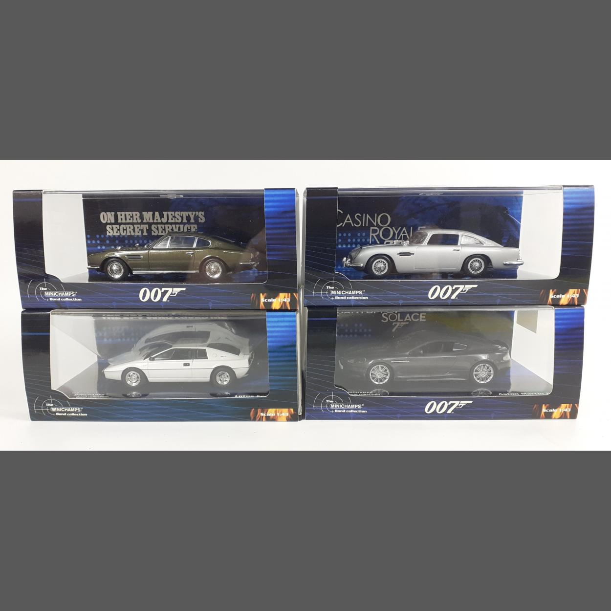 Four MINICHAMPS 1:43 Scale cars from the James Bond collection including a LOTUS ESPRIT S1 , an ASTON MARTIN DB5 in silver , an ASTON MARTIN DB5 in grey and an ASTON MARTIN DBS all the cars are in a new and unopened condition