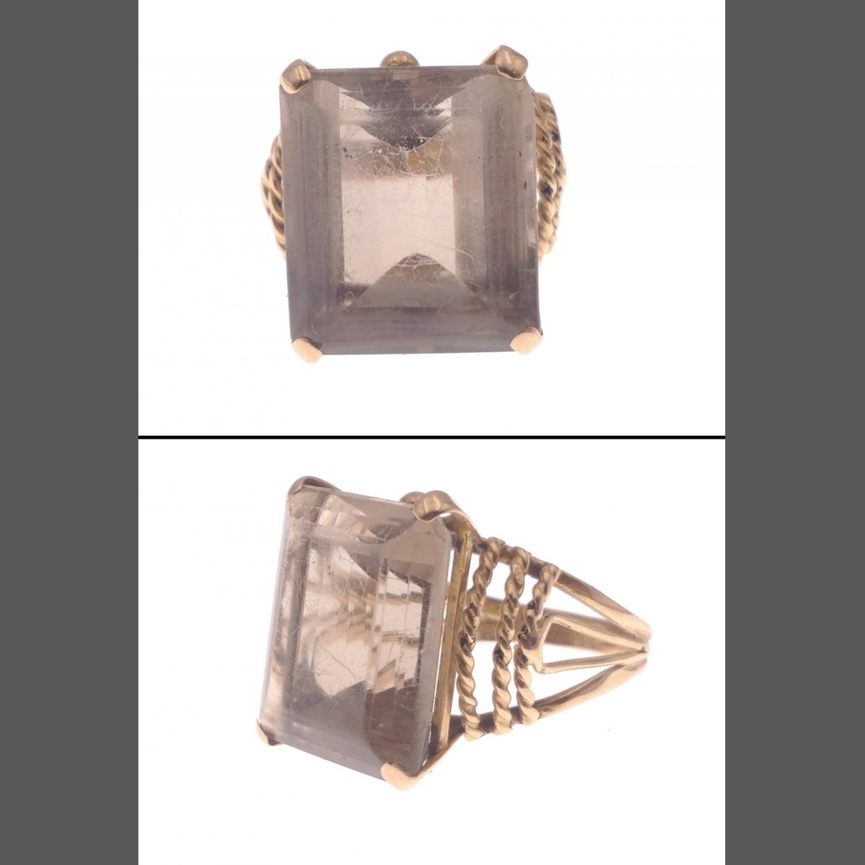 A WHOPPER of an emerald-cut smokey quartz stone mounted on an EGYPTIAN 18 carat hallmarked (large mount) ring, size P total gross weight 9.31g approx