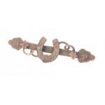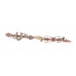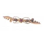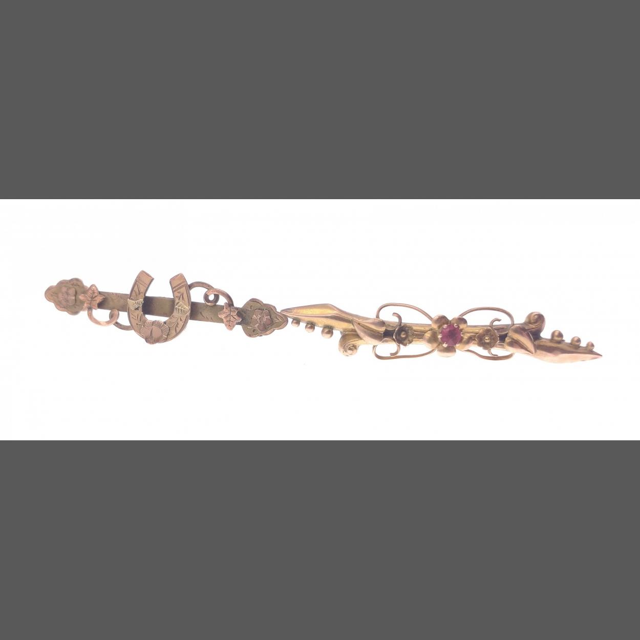 A 9ct bar brooch with a horseshoe emblem centred with floral decoration - steel pin and gross weight 1.82g approx, 4cm in length approx and also with another 375 stamped bar brooch featuring floral and heart-shaped embellishments and a small garnet centred with steel pin length 5cm approx and gross weight 1.96g approx