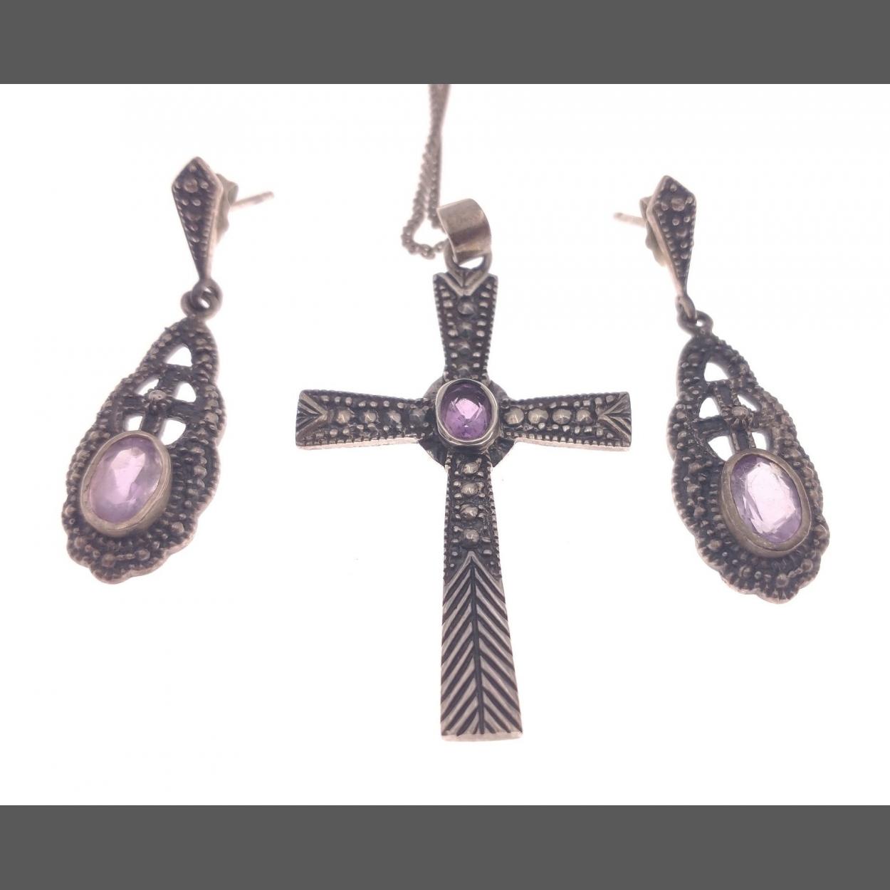 A LOVELY 925 stamped SILVER cross pendant with small amethyst centred dimensions 4cm height x 2.5cm across approx, on a 925 stamped silver chain - with a pair of earrings to match - gross weight 11.51g approx