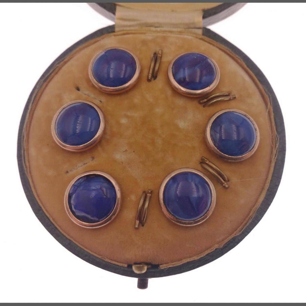 A boxed set of six EDWARDIAN yellow metal blue agate shirt studs (2 fasteners missing and 1 stud damaged)