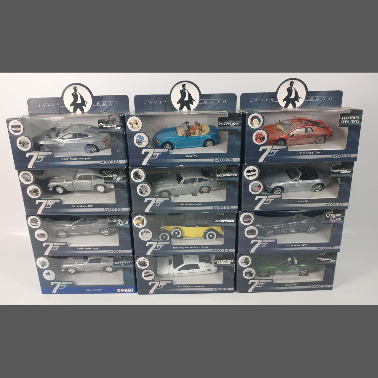 A collection of 12 CORGI James Bond 1:36 models all new in boxes including JAGUAR XKR model CC07603 , ASTON MARTIN DBS model CC03802 , LOTUS ESPRIT UNDERWATER model CC04512 , ROLLS ROYCE 111 SEDANCE DE VILLE model CC06803 , ASTON MARTIN DB5 model CC04310 , ASTON MARTIN DBS CC03801 , BMW Z8 model CCO5004 , ASTON MARTIN DB5 model CC04306 , ASTON MARTIN model CC04309 , LOTUS ESPRIT TURBO model CC04704 , BMW Z3 model CC04904 and an ASTON MARTIN VANQUISH model CC07503