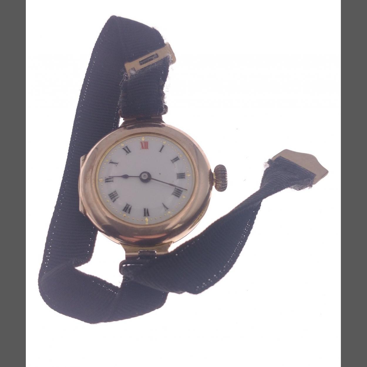 A yellow gold lady's watch on black ribbon with 375 stamped circular watch case (2.75cm, dia), with Roman numerals, gross weight 17.05g approx