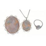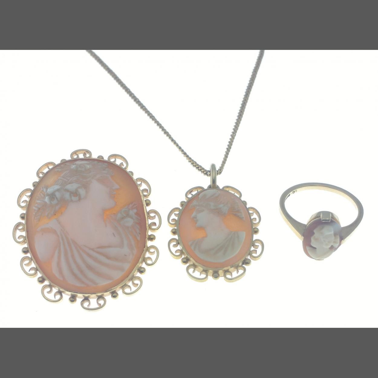 A cameo set in 18ct stamped gold comprising 1 pendant chain 38cm long, pendant 2.5x2.0cm, 1 brooch of a classical lady (4x3cm), 1cameo ring size I/J, total gross weight 18.35g