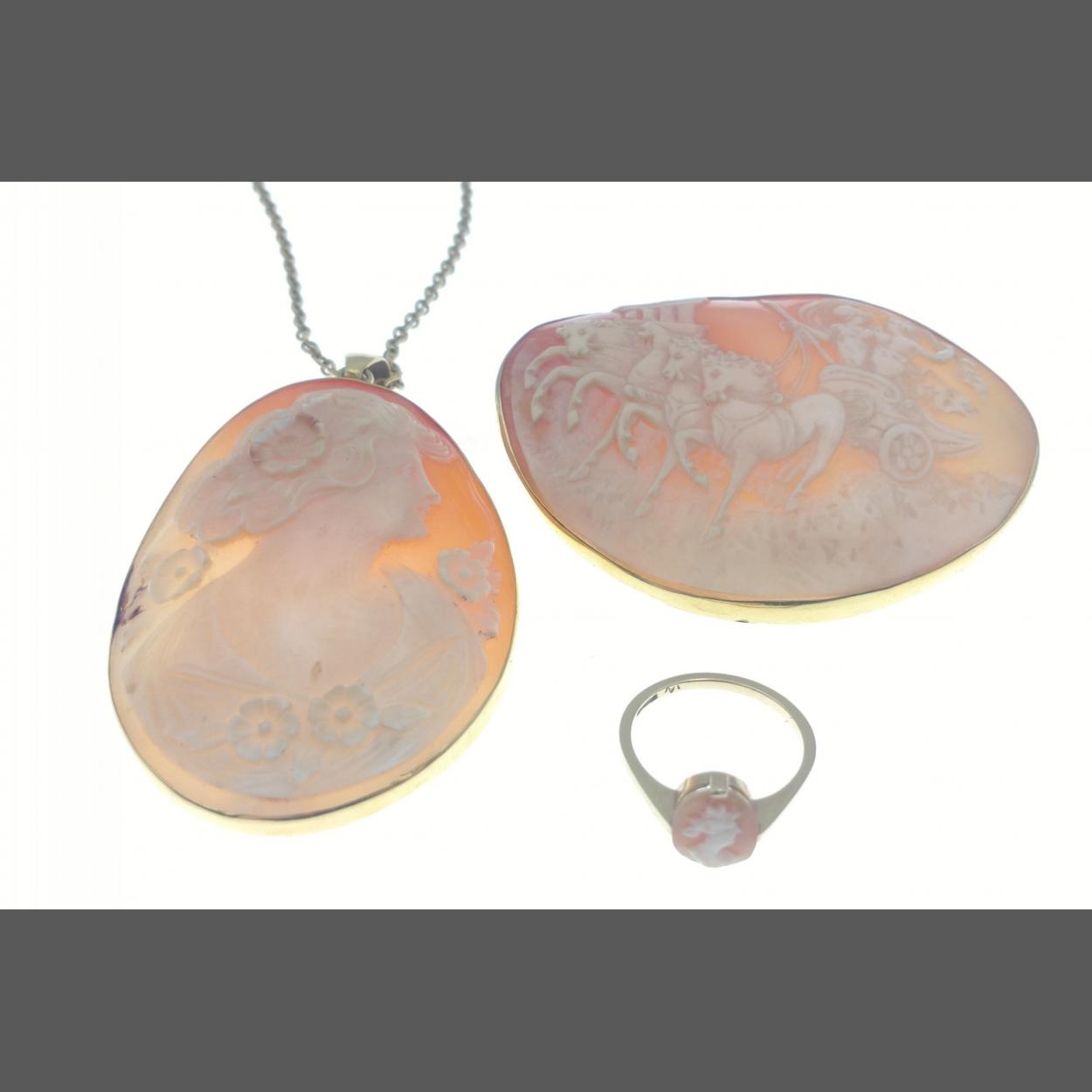 A cameo lady pendant in 18ct gold (5x4cm), with a 15ct 70cm chain, a cameo brooch of horse and carriage 5.5x4.25cm, a cameo gold ring Size I/J, total gross weight 43g plus a semi-precious stone brooch