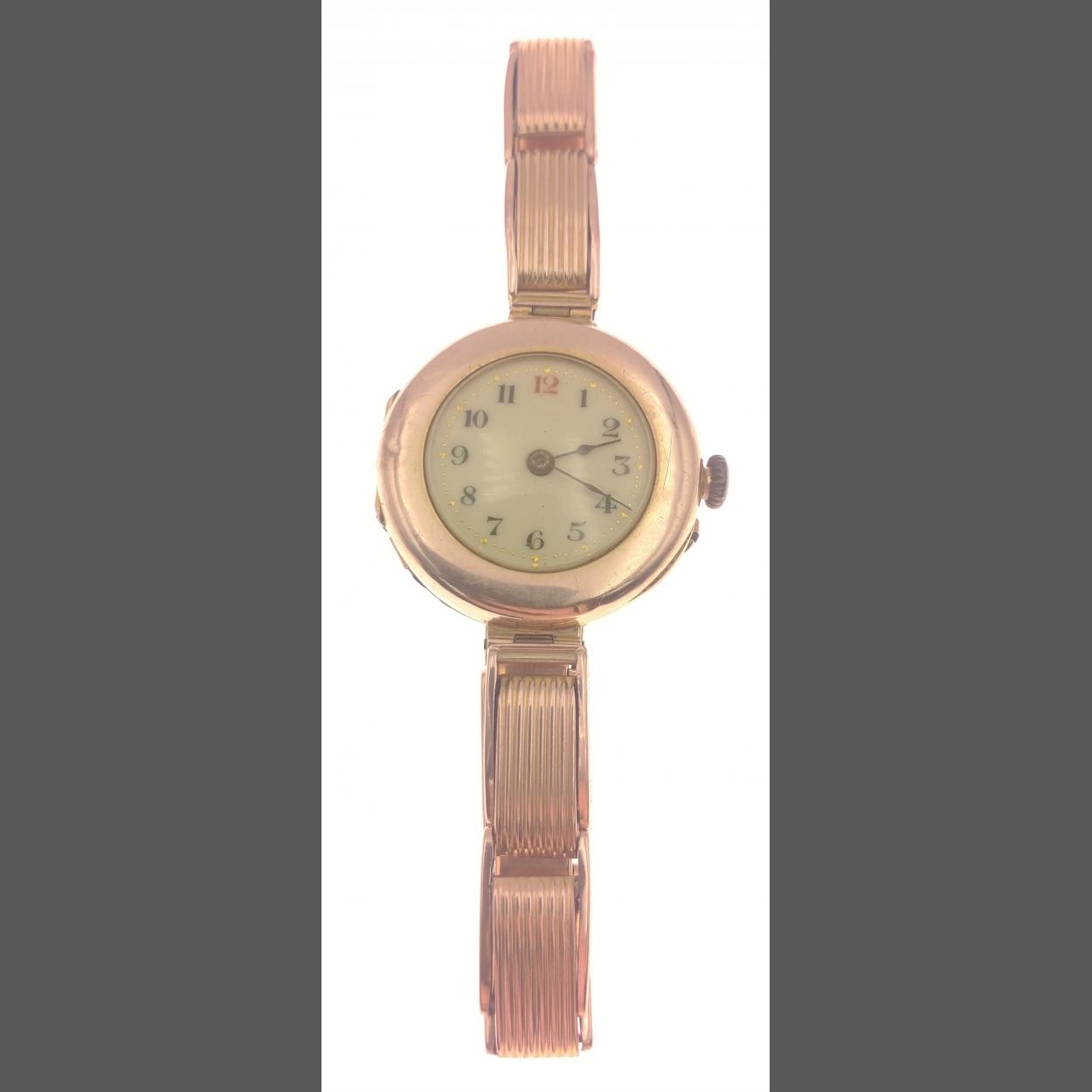 A lady's yellow gold watch with a stamped 375 case (2.75cm dia) and English made 9ct bracelet, with a replacement winder, gross weight 26.6g approx