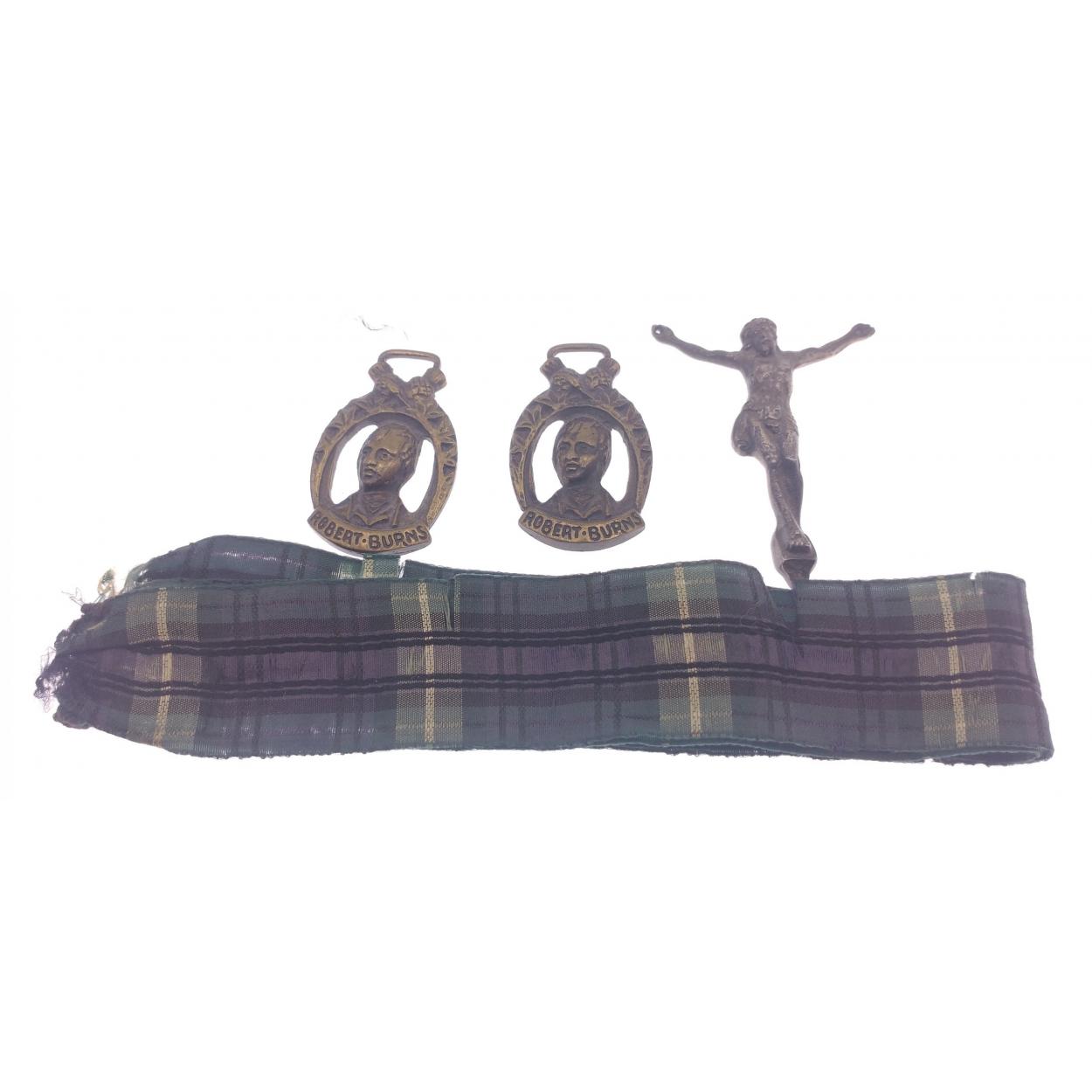 Two VINTAGE Robert Burns pendants on tartan ribbons 4x2.5cm and a white metal Christ on the cross pendant 5.5x4.5cm