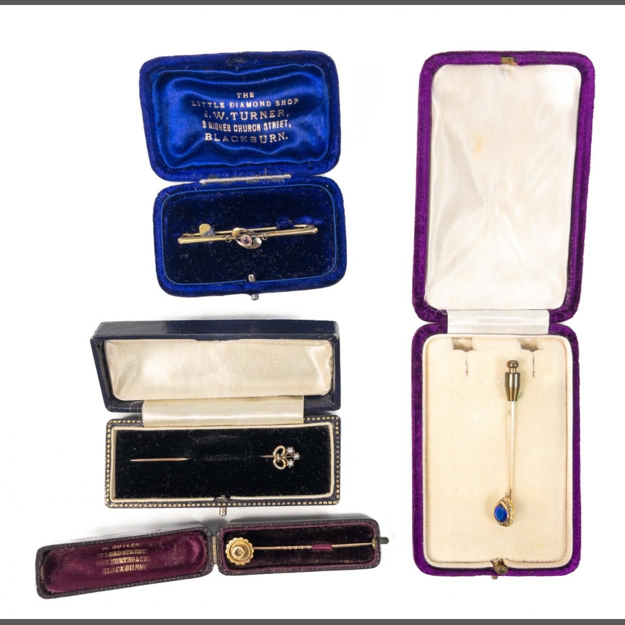 One gold tie pin 5.5cm (weight 1.15g approx), a sapphire and gold tie pin 6cm (gross weight 2.10g approx), a pearl and gold tie pin 6cm (gross weight 1.5g approx), an amethyst tie pin 5cm (gross weight 1.2g approx)