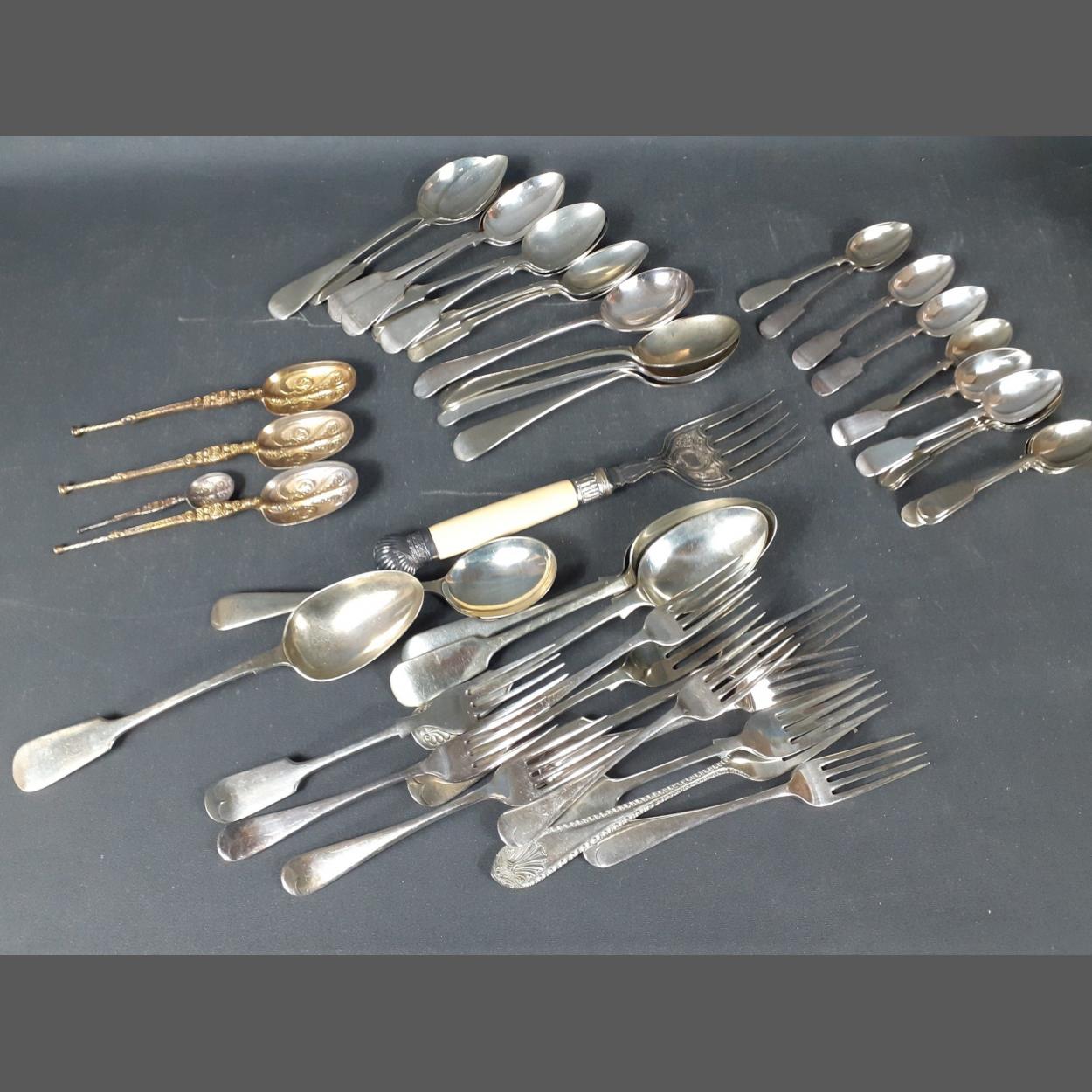 A box of assorted EPNS quality flatware. Some very attractive and useable pieces included, over forty pieces in all. Includes a box with gilt fruit spoons.