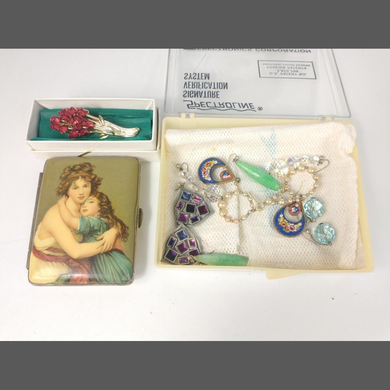 A VINTAGE classical style transfer mother and child embracing cigarette tin with gilt interior dimensions 8cm height x 6.5cm with also a yellow metal brooch depicting life-like red roses 5cm length , also 6 pairs of VINTAGE earrings to include an ITALY stamped micro-mosaic pair with tiny floral decoration