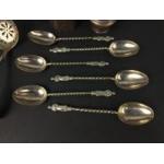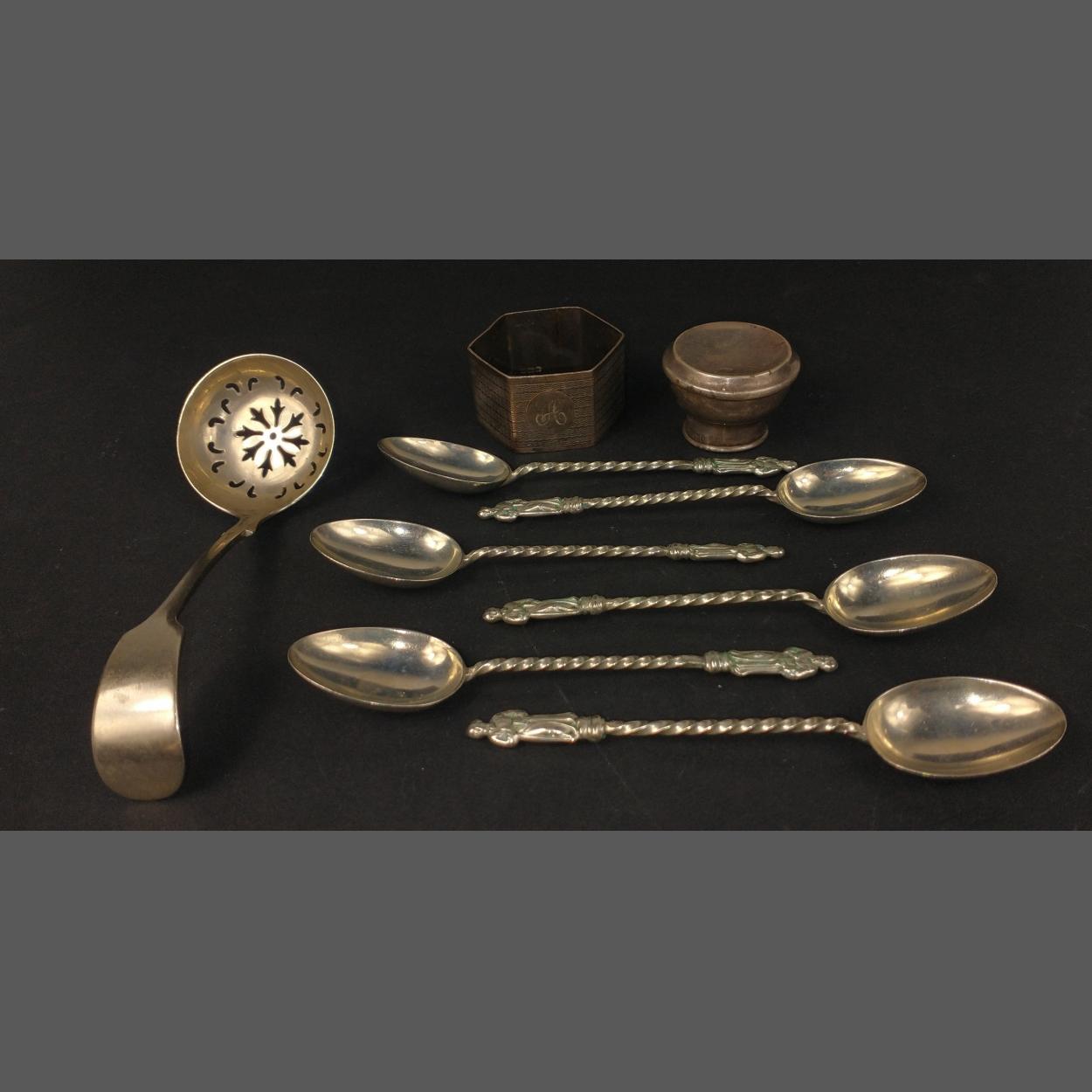 NICE EXAMPLE six EP twisted-stem APOSTLE teaspoons length each 10.5cm approx with also a silver BIRMINGHAM hallmarked single napkin ring in hexagonal form weight 21.75g approx and a silver cane top with a hallmark for Birmingham weight 7.42g approx and lastly a NEVADA SILVER small sugar sifter in ladle form 23.5g approx