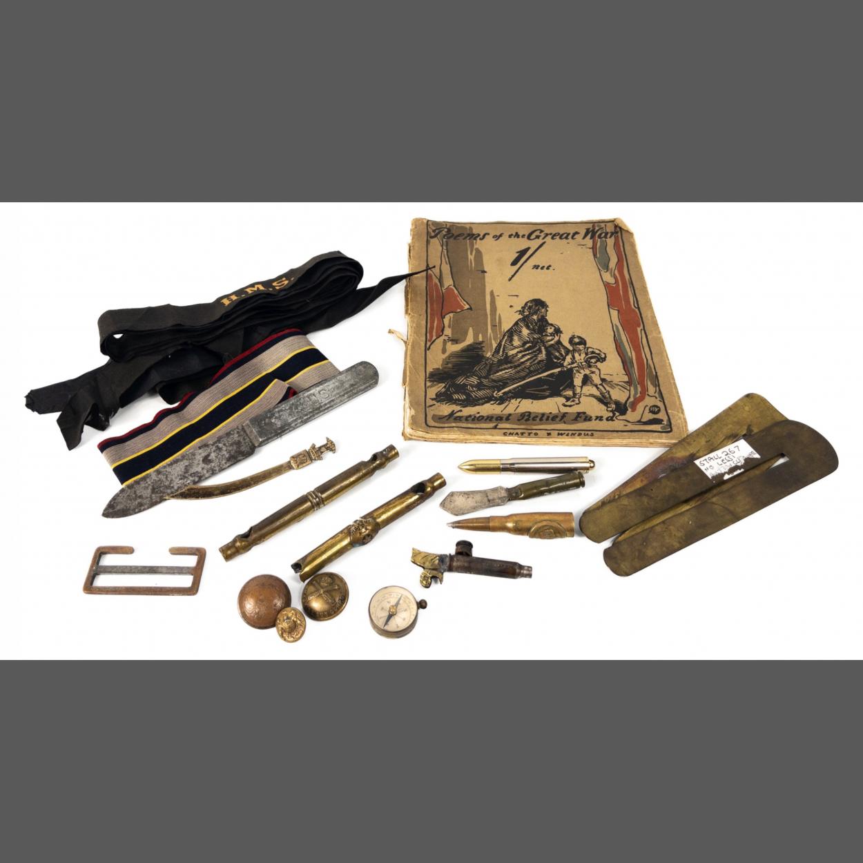 lighter, two button cleaning bars, three Royal Navy H.M.S. cap tallys and an arm band. Also includes a copy of National Relief Funds POEMS OF THE GREAT WAR