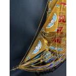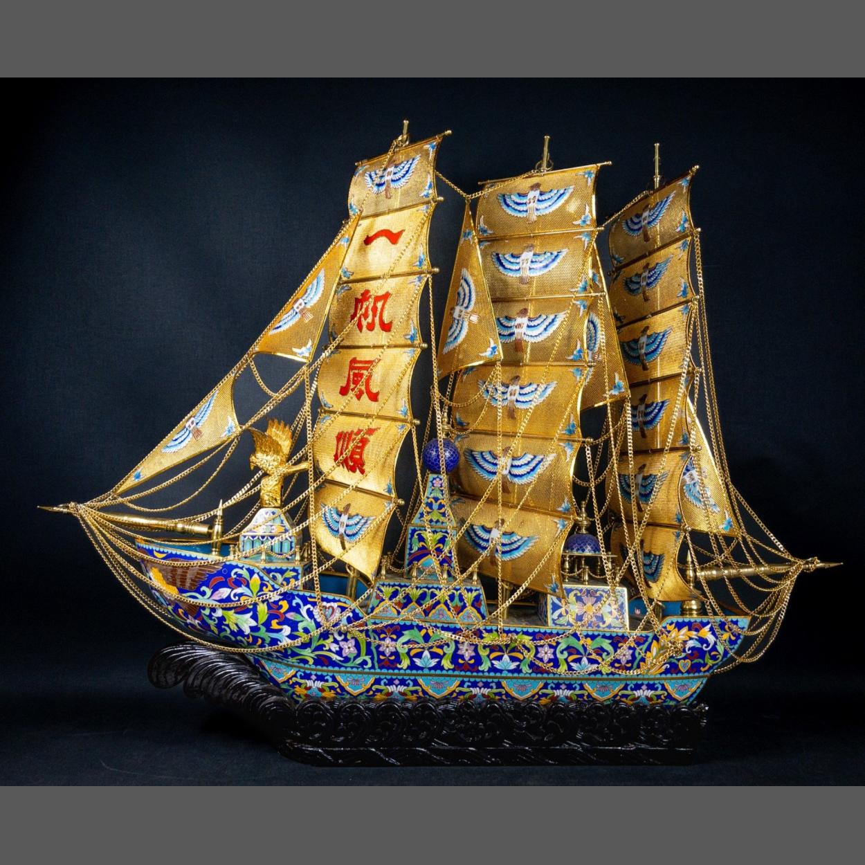 IMPRESSIVE DECORATIVE VERY LARGE ORIENTAL Red Copper/brass Cloisonne enamelled Galleon ship in full sail with good luck statues sitting on a carved wooden oriental base - there is slight gilding missing from the tip of one of the wings of the good luck eagle statue, a little minor scratches as one would expect commensurate with age etc - but a beautiful decorative piece!