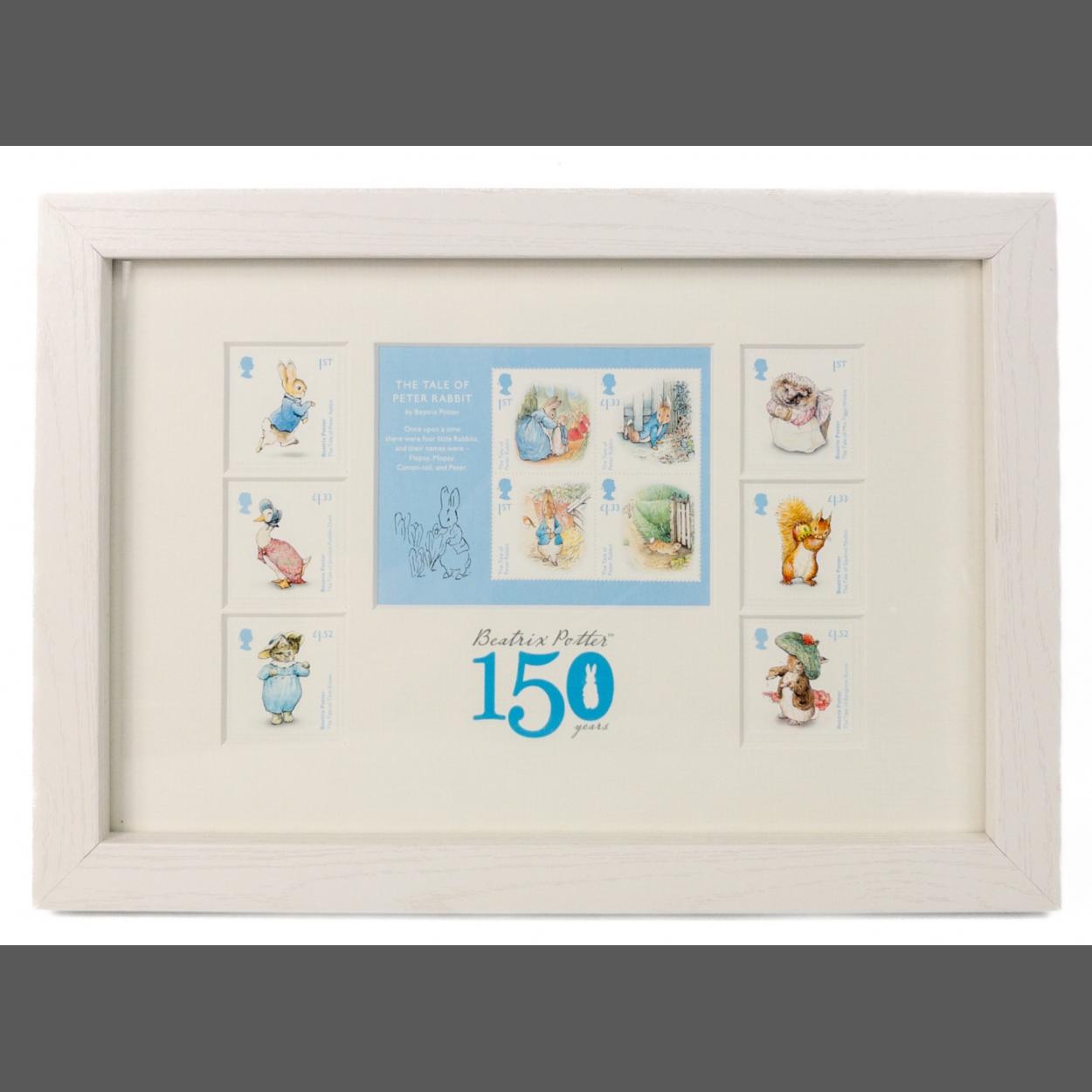 A framed set of BEATRIX POTTER 150 years Tale Of Peter Rabbit ROYAL MAIL 1st Class stamps collection - dimensions of frame 33cm x 23cm