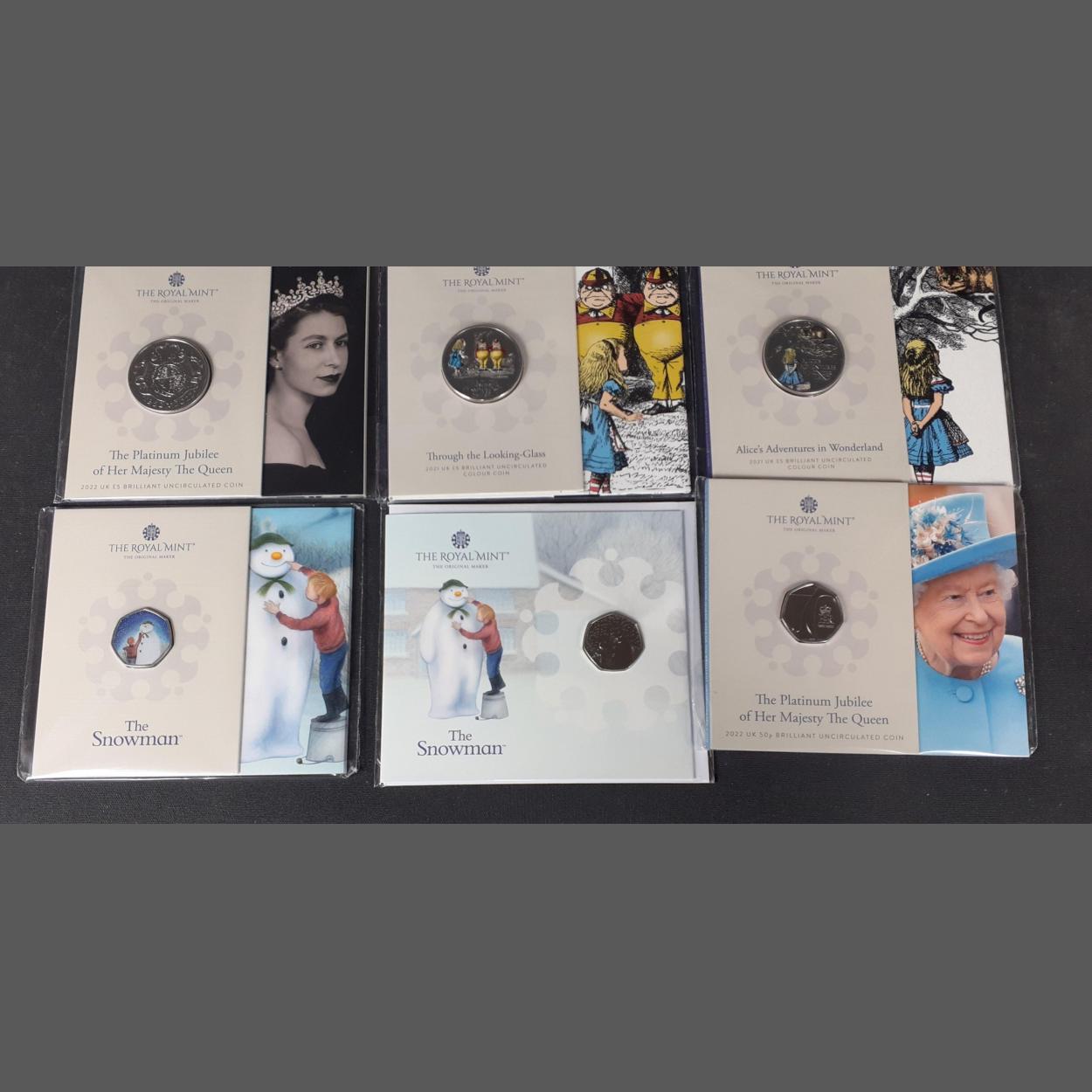 THE ROYAL MINT Small presentation sleeve collection with mint coins to include Through the Looking Glass BUNC £5 x2, Platinum Jubilee BUNC £5 and three similar 50p's. Six sleeves in total.
