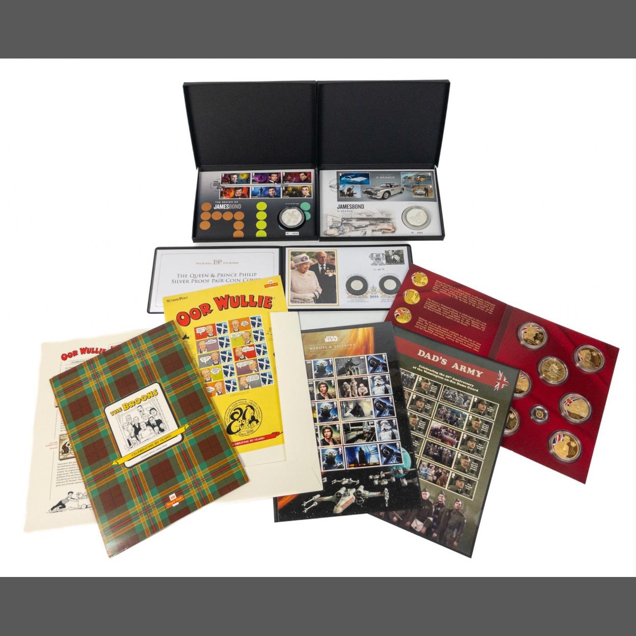 Two Royal Mail James Bond 007 silver proof coins in boxes. This lot also includes Queen Elizabeth II 90th Birthday gilt coin set with crystal inserts, 90th Birthday Jubilee Mints coin pair in folder and Royal Mail Oor Wullie and the Broons stamp sheets in folders along with Dads Army and Star Wars sheets. An interesting lot!