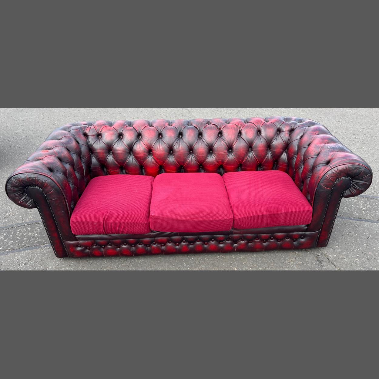 Rather worn BUT FABULOUS! red leather effect CHESTERFIELD couch 3 seater (matching 2 seater(s) Chesterfields in subsequent lots)