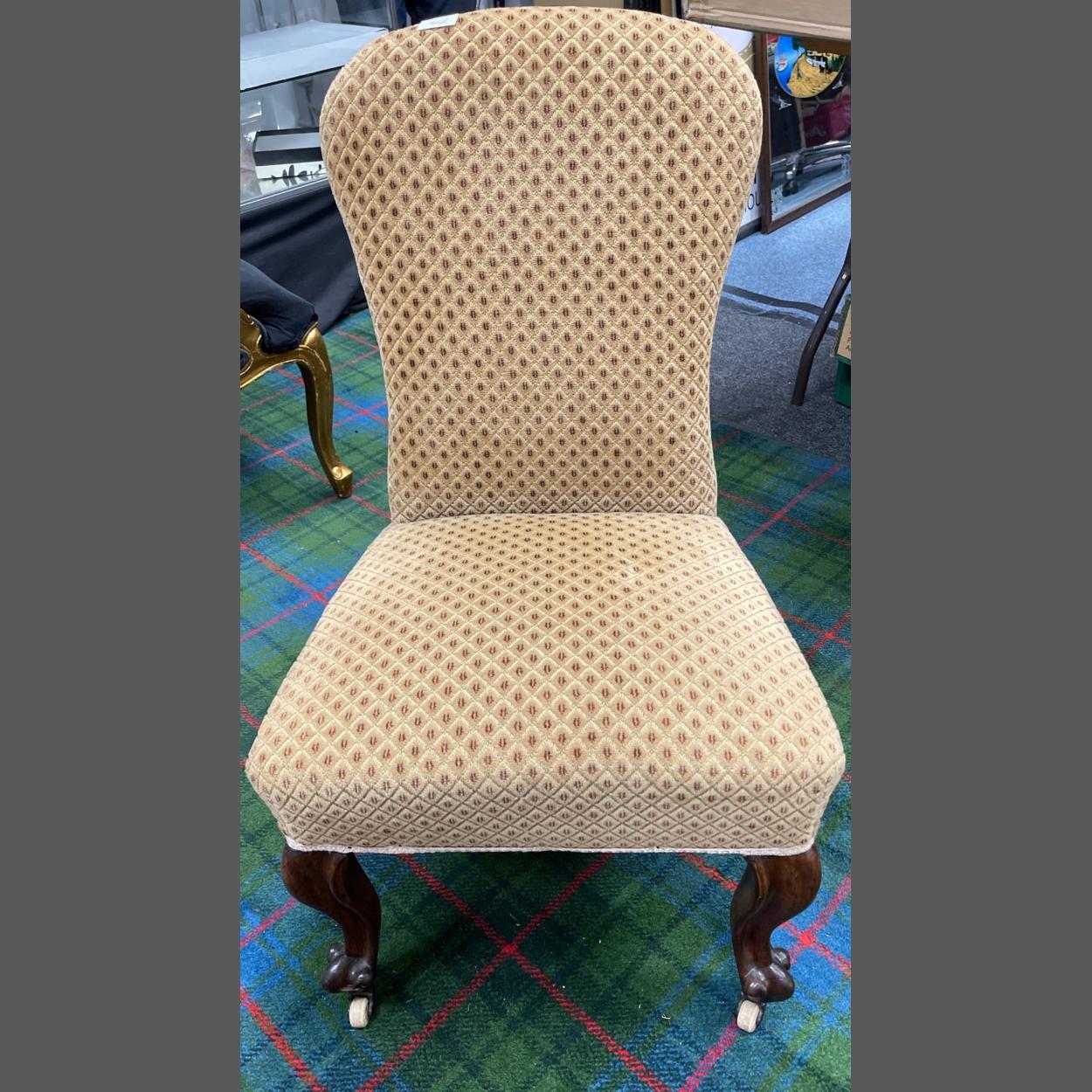 A good example of an EDWARDIAN upholstered low chair with mahogany legs and claw feet on original porcelain castors - dimensions 82cm height x 52cm width x 45cm depth approx