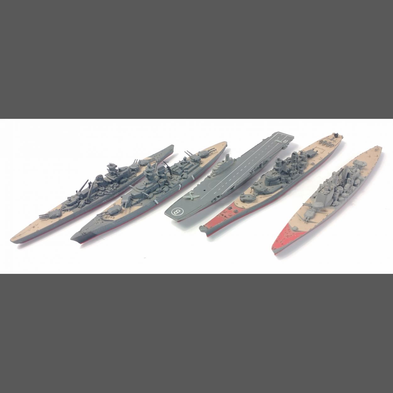 Five model die-cast ships to include The BISMARK M74, THE VANGUARD, The SCHARNHORST M745, THE MISSOURI M743 and HMS BULWARK M751 model ship air craft carrier, largest length 18.5cm