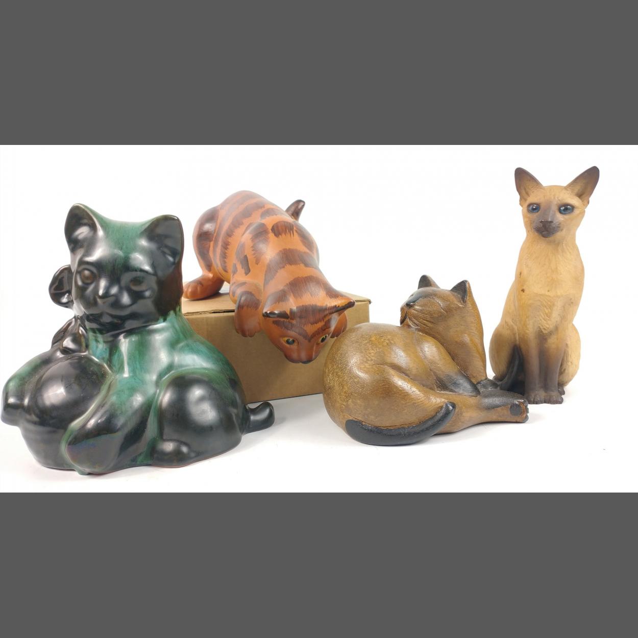 A group of four cat figures in various media including a curled up wooden cat (10cm high), a North Light Wade resin Siamese cat (17cm), a terracotta green kitten with ball (16cm), and a Devon Ceramics marmalade cat with his head hanging over the shelf
