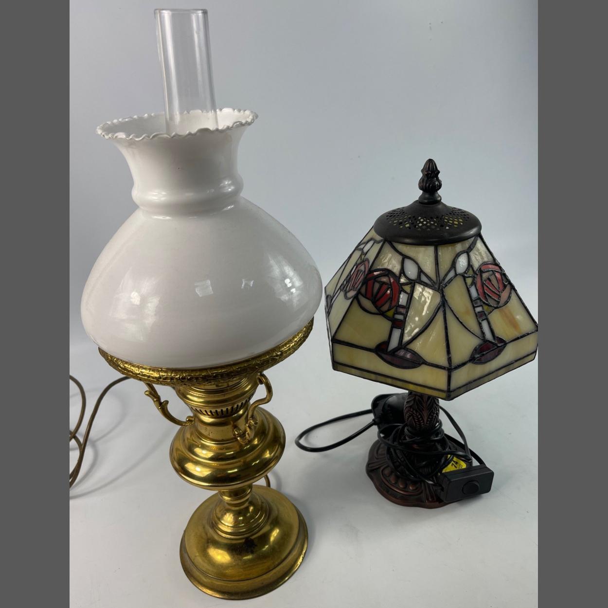 Two reproduction lamps to include a brass lamp with milk glass shade (damage to shade) and a TIFFANY inspired table lamp 34cm high approx.