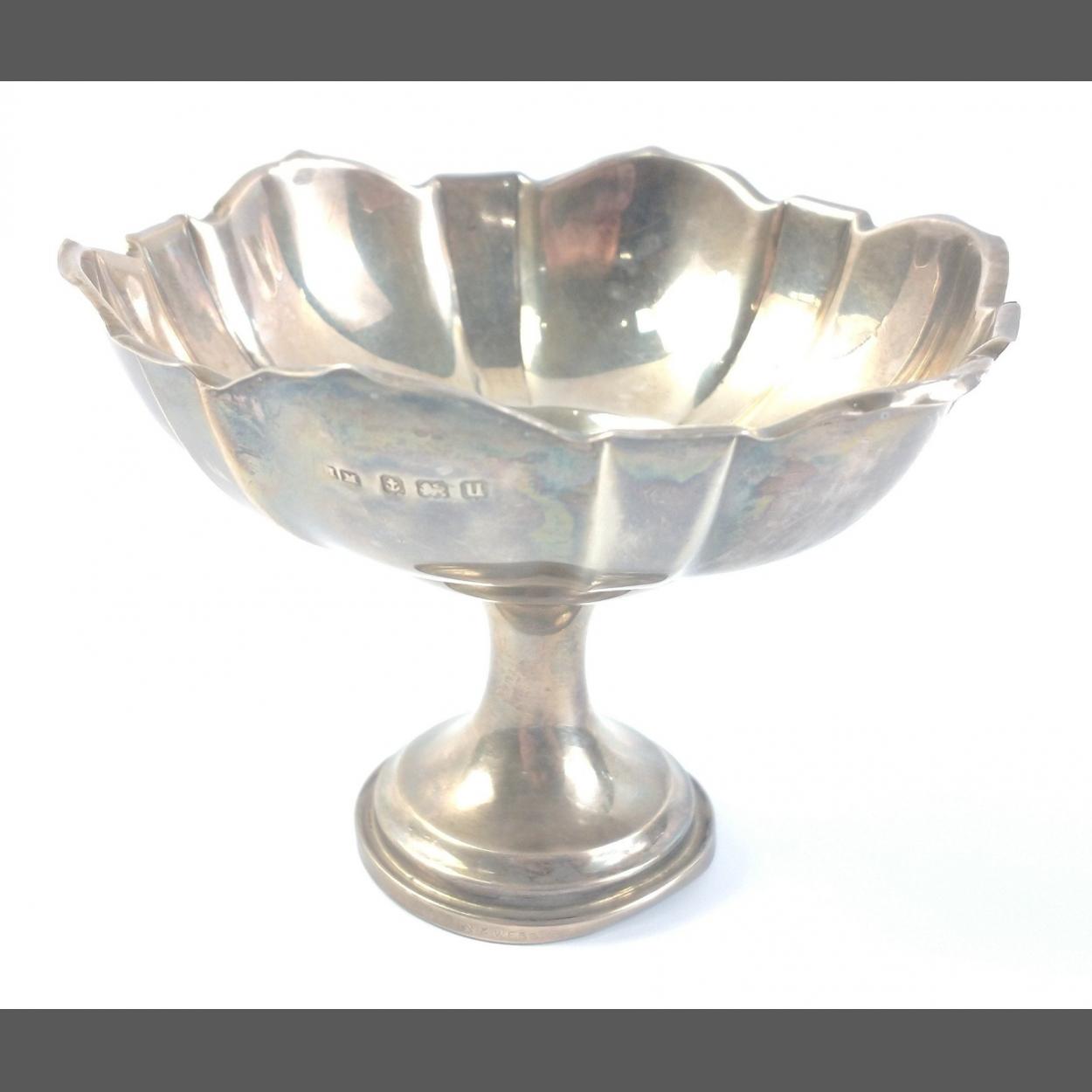 A small hallmarked, Birmingham 1919, silver bowl with scalloped edges on a stand 10cm dia, height approx 8cm, gross weight 98g