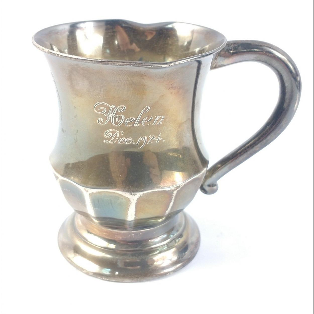 A small hallmarked, Birmingham 1923, silver Christening mug stands 9cm tall, 2 small dents in rim, inscribed to Helen Dee, 1924, weight 123g